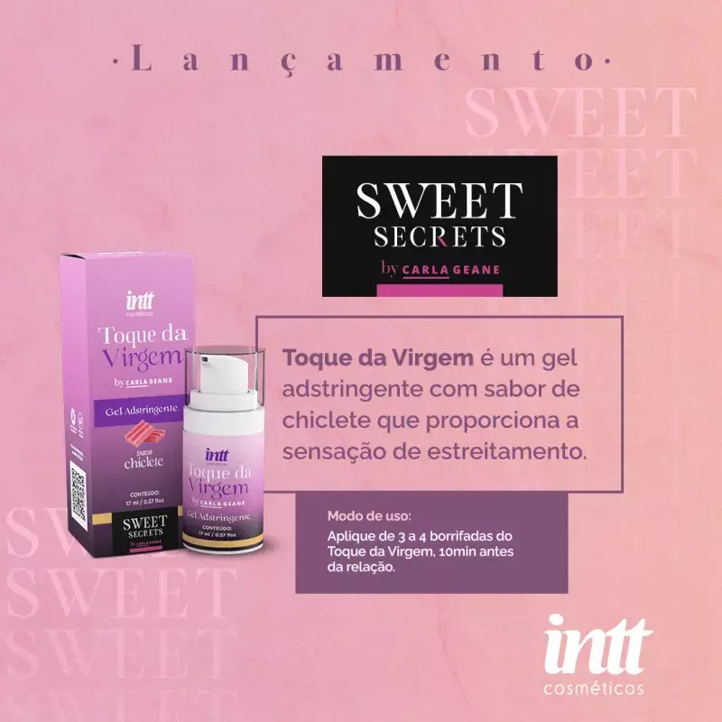 Toque da Virgem Adstringente Feminino com Aroma de Chiclete 17ml – Intt Cosméticos Parte da linha Sweet Secrets, o Toque da Virgem foi desenvolvido em parceria com Carla Geane para mulheres que desejam reviver sensações intensas, com um toque de mistério, poder e sensualidade. Este gel adstringente promove a sensação de estreitamento vaginal, criando um efeito momentâneo de “primeira vez” com aroma e sabor de chiclete, ideal também para potencializar o sexo oral.